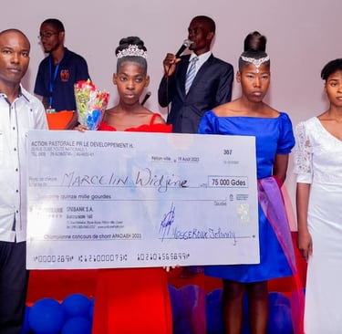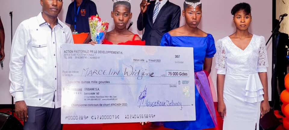 Widjine Marcelin brille en remportant la première édition du concours de chant "Ma contribution à la paix en Haïti," organisée par l'APADEH (Action pastorale pour le développement humain).